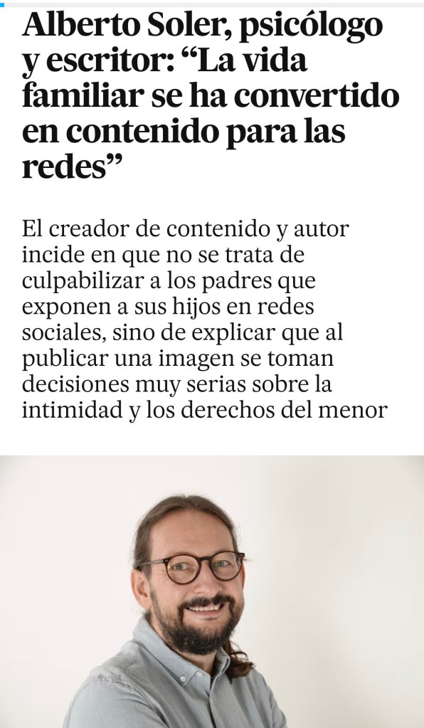 Las redes sociales, el uso de dispositivos en la infancia, el sharenting y otros temas de actualidad, en esta entrevista que he realizado a Alberto Soler para El País.