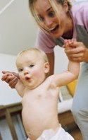 - Desde la posición de sentado se agarrará al adulto o a un objeto para trepar e intentar ponerse de pie. Dejar que lo haga solo. No poner jamás a un bebé de pie a modo de juego, ya que propicia que tarde más en ponerse él solo de pie. Igual que a la hora de sentarse, el bebé debe ponerse de pie cuando su musculatura y su desarrollo cognitivo se lo permita, no antes. Siempre solo.