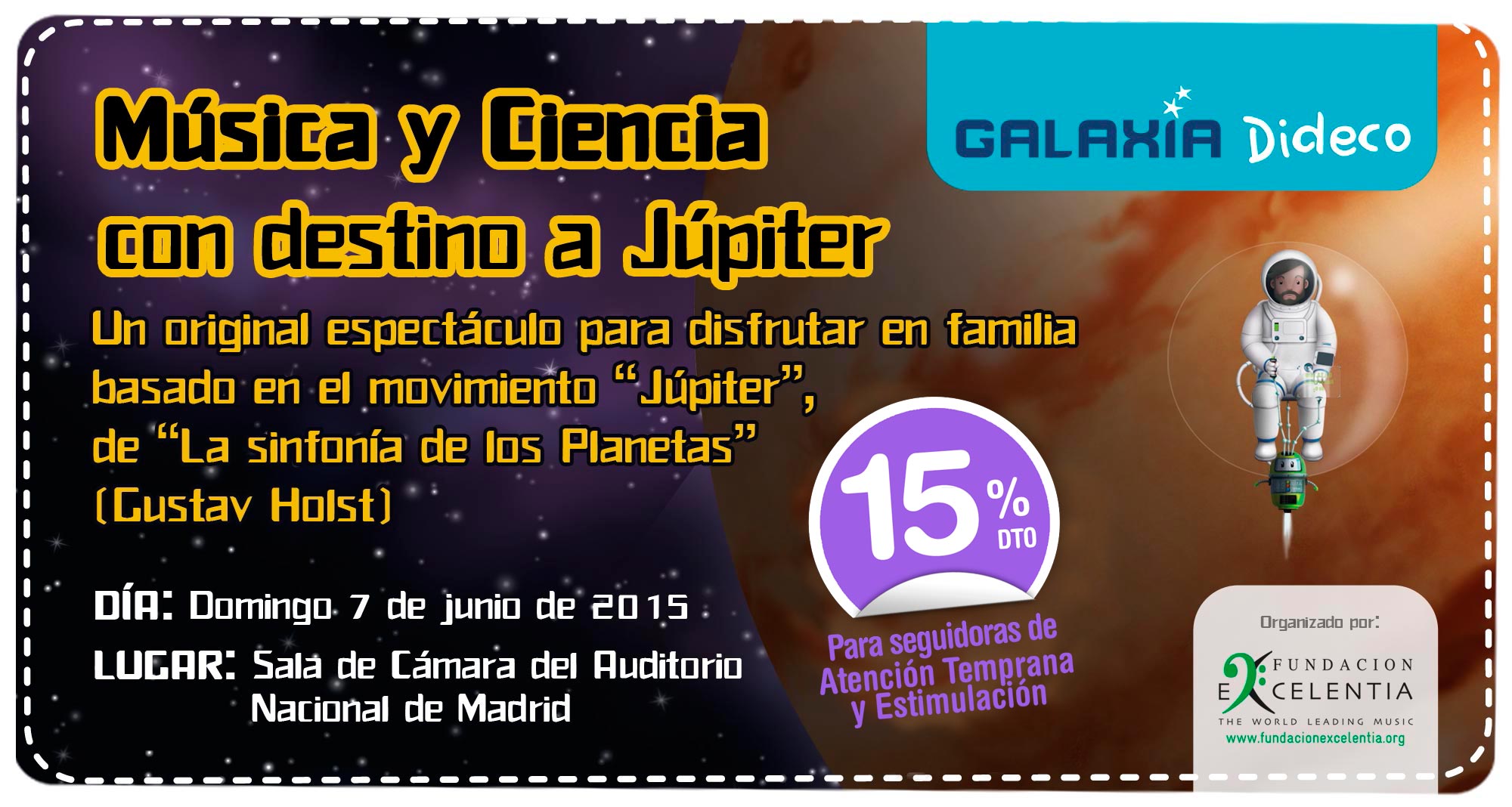Dideco ha organizado junto a la Fundación Excelentia un original espectáculo «Música y ciencia con destino a Júpiter», para disfrutar en familia y pasar un buen rato a la vez que aprendemos y estimulamos nuestros sentidos.