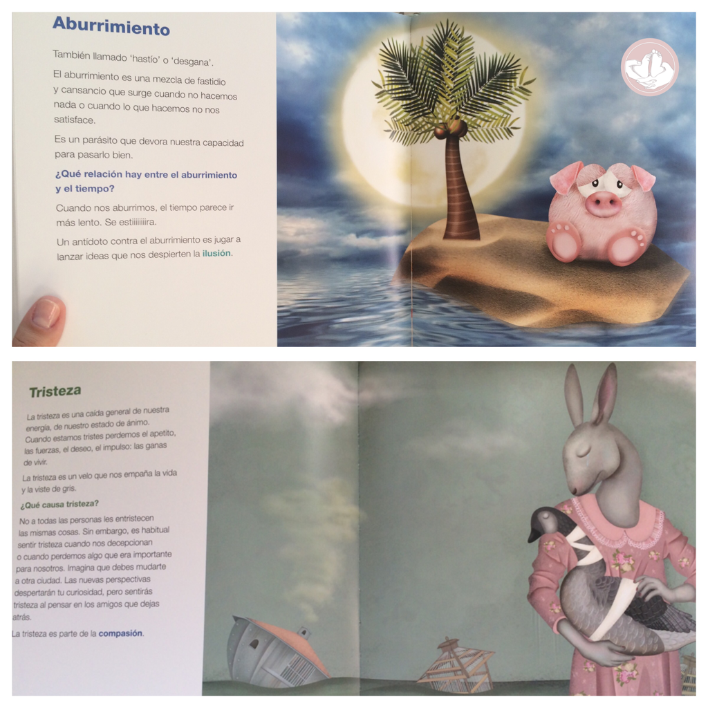 Este libro es un diccionario de emociones, donde podemos encontrar algunas más básicas y sencillas de comprender, a partir de los dos o tres años (tristeza, alegría, miedo, vergüenza, ilusión…), algunas más complejas que comprenderán los niños desde los cinco o seis años (amor, aburrimiento, culpa, celos…) y otras que necesitarán de una mayor madurez y experiencia, que serán propias de identificar a partir de los siete u ocho años (serenidad, remordimiento, gratitud…).