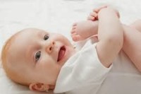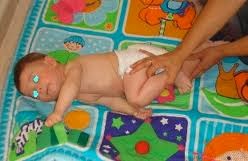 4.  En decúbito prono ofrecerle objetos delante de sí mismo, en el suelo, a unos 20 centímetros favoreciendo la reptación, que se arrastre para conseguir el objeto. Podemos ayudarle doblándole una pierna y empujándole desde la planta del pie. Es decir, en la postura que vemos en la foto, ofrecerle apoyo en la planta del pie para que se impulse.
