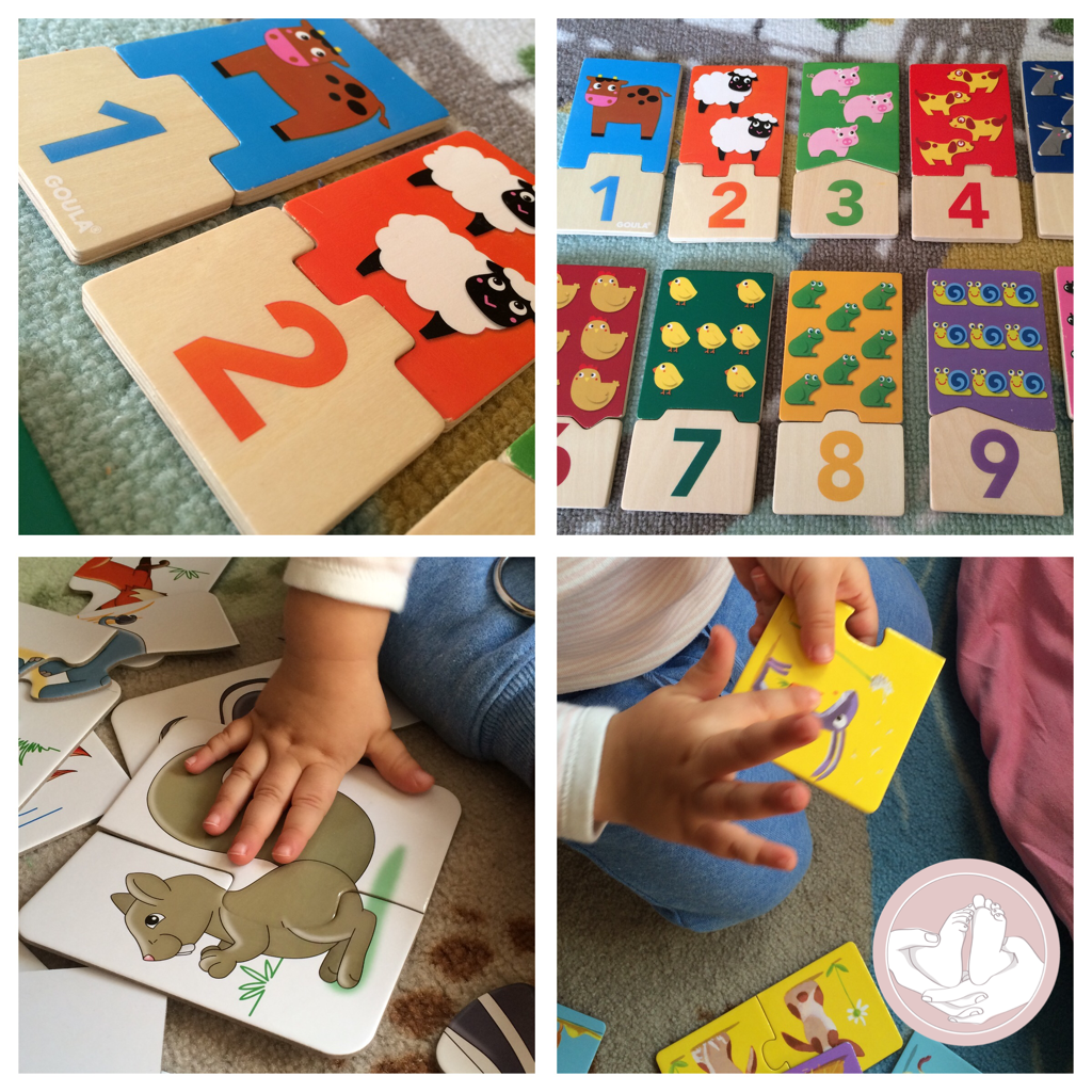 1. Los primeros son los puzles de madera de dos piezas de Goula, los cuales están formados por el dibujo de un animal o varios y un número correspondiente a la cantidad de animales que aparecen en la otra pieza.